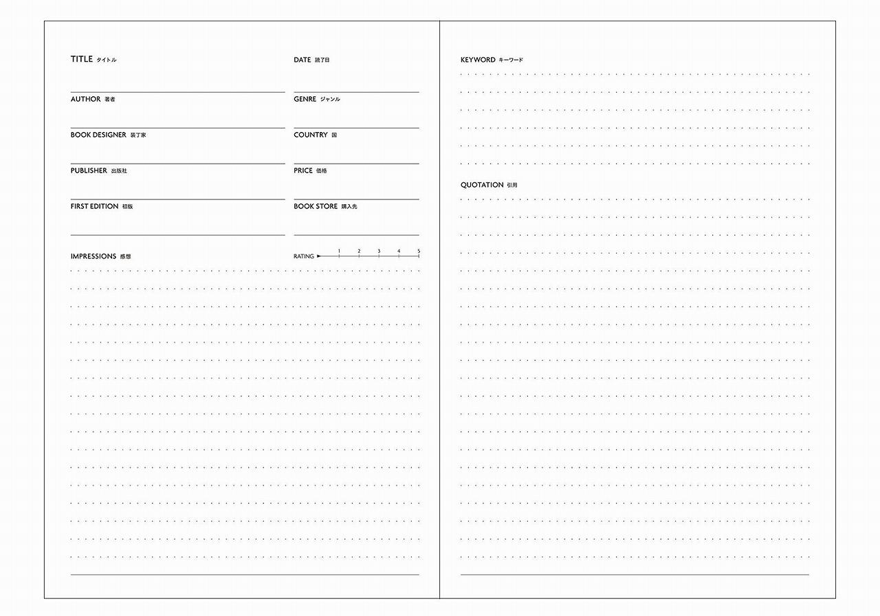 メインの「ブックジャーナル」ページです。読んだ1冊の本の感想を見開きでまとめられます。基本情報の項目が充実していて、タイトル 、 著者、装丁家、出版社、初版 、読了日、ジャンル、国、価格、購入先 、評価、感想、キーワード、 引用と全14項目あり、項目を書き進めていくのが楽しくなります。