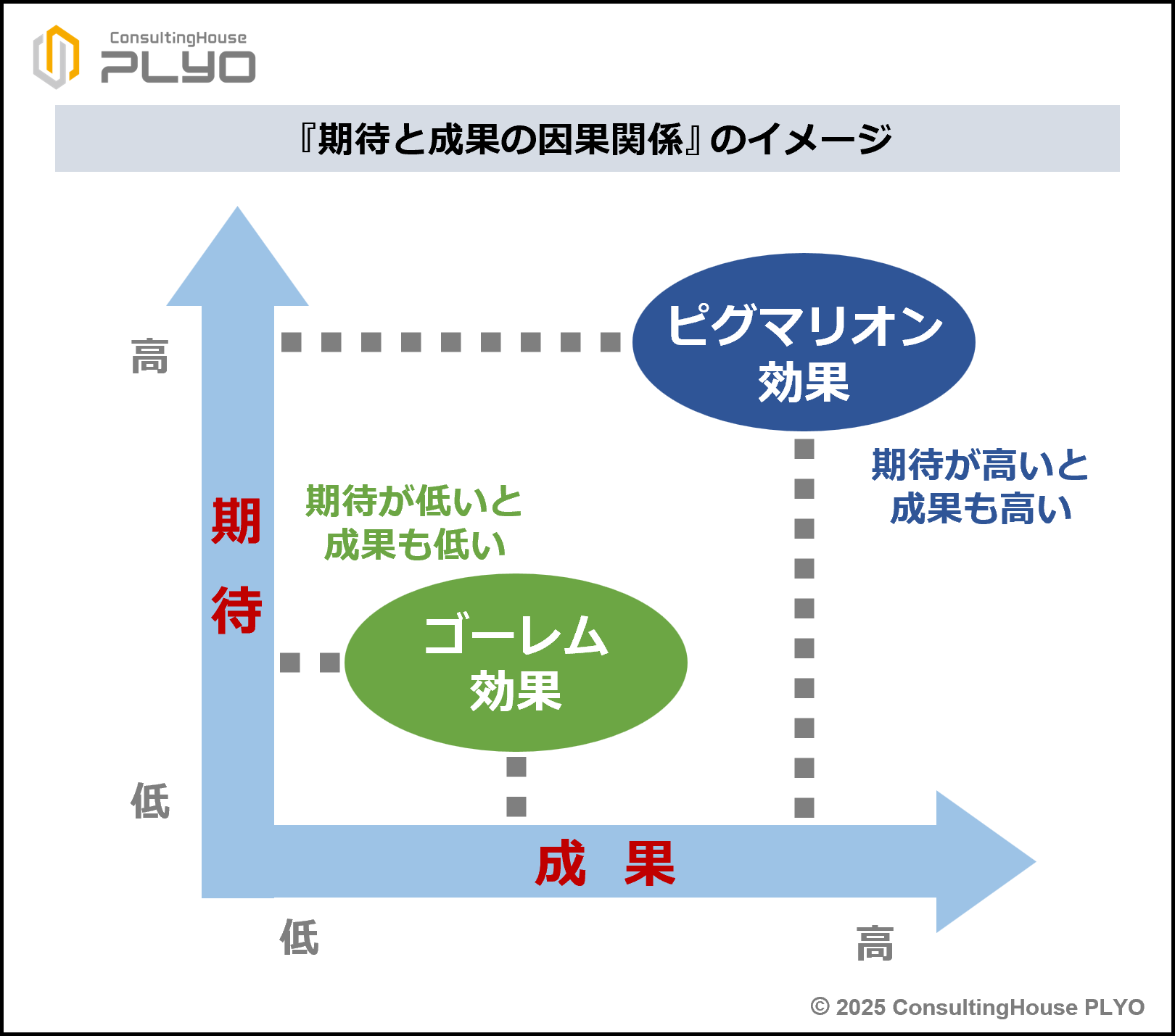 高い期待が高い成果を導く仕組みをピグマリオン効果、低い期待が低い成果を導く仕組みをゴーレム効果という。