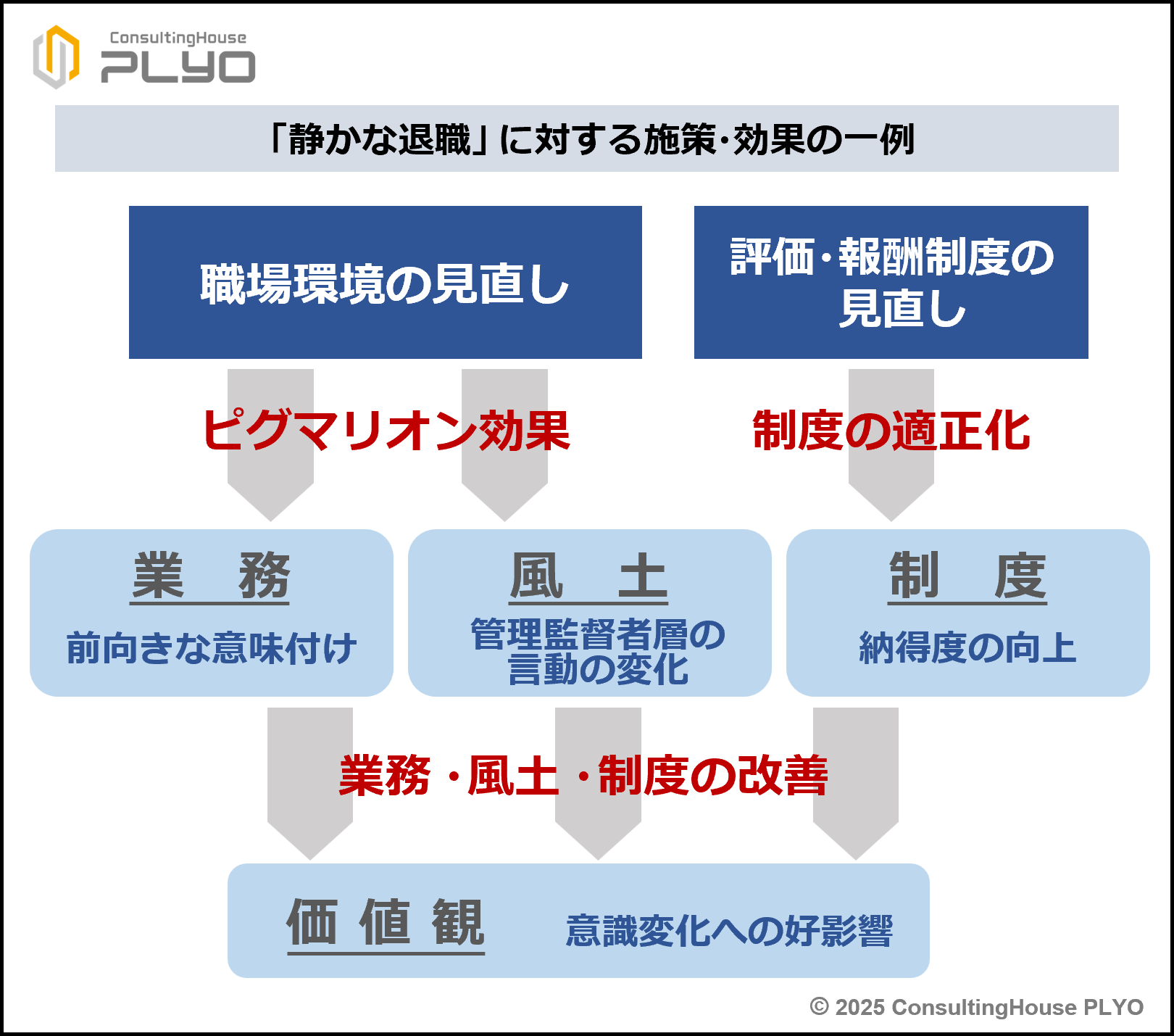 しかしながら、「静かな退職」に即効性を期待できる改善手法は存在しない。人事部門としては、根気強く取り組むことが肝要といえよう。