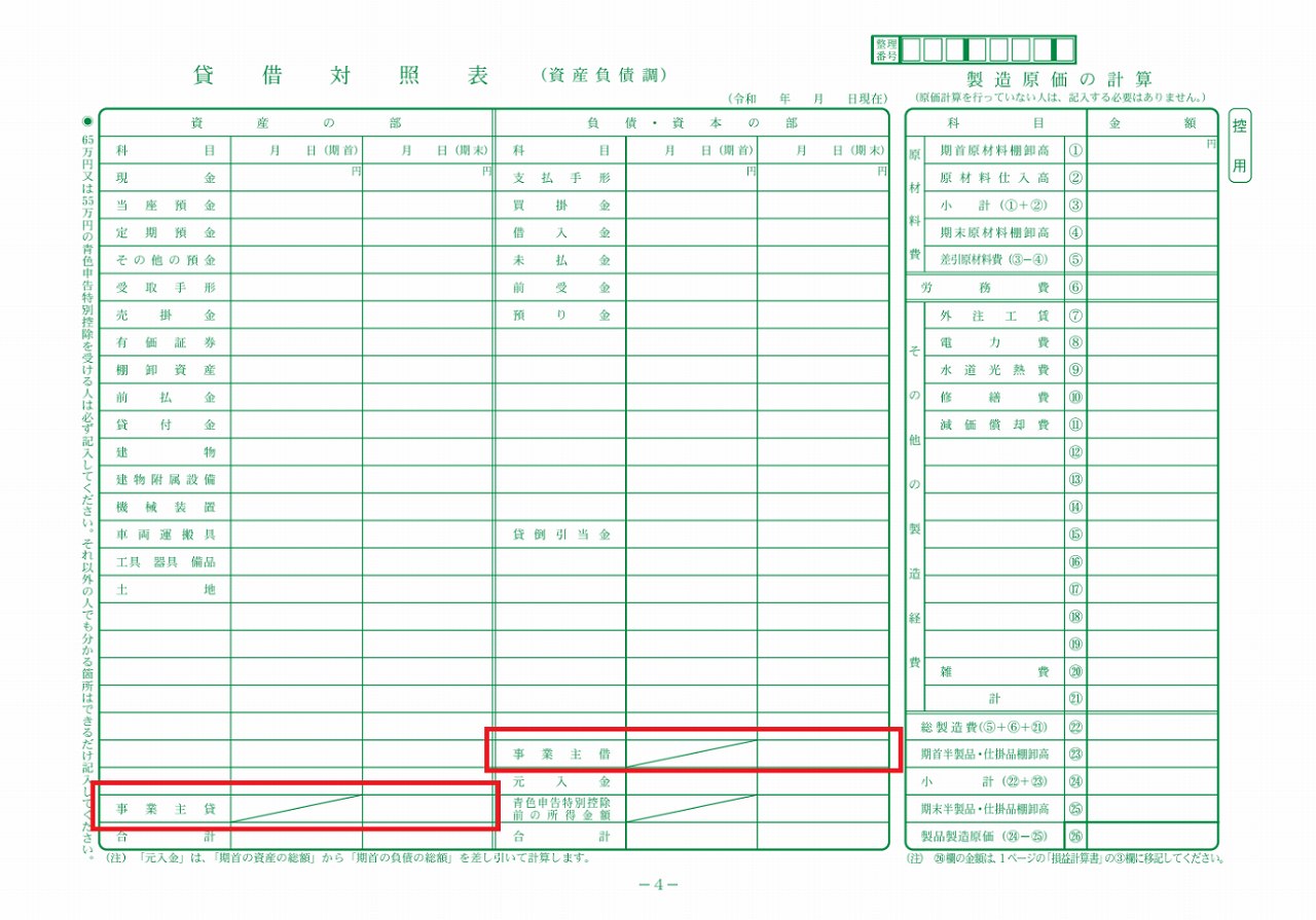 青色申告決算書に「事業主貸」「事業主借」は現れます。4ページ目の貸借対照表です。