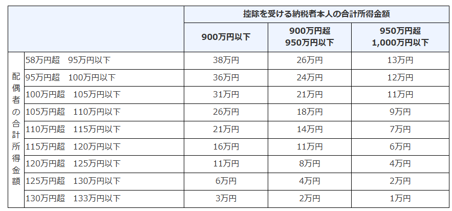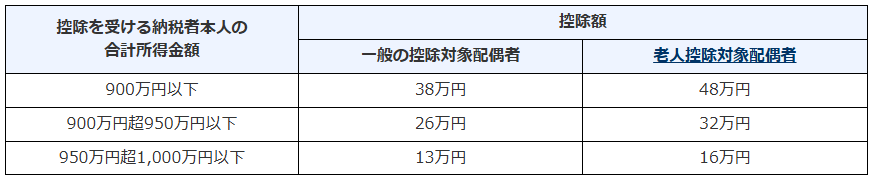 配偶者控除とは、配偶者がいる場合に所得額から一定金額を差し引かれる制度を言います。控除額は本人の所得額と配偶者の年齢によって次のように決まります。