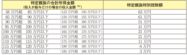 2025年度(令和7年度)税制改正で新設された制度です。大学生相当の年齢の親族等を扶養している場合、所得者は最大63万円の控除を受けられます。この制度では、親族等の所得額が58万円超123万円以下であることが条件の一つとなっています。特定親族の所得額と控除額の関係は次の通りです。