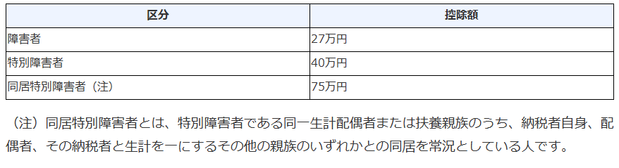 所得者本人あるいは配偶者控除の対象となる配偶者(同一生計配偶者)や扶養控除やひとり親控除、寡婦控除の対象となるような扶養親族が障害者である場合に、一定額が所得者本人の所得額から差し引かれる制度です。なお、この場合の扶養親族には、扶養控除のような年齢制限はありません。