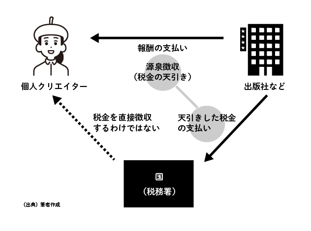 源泉徴収のしくみでは、クリエイターのみなさんが確定申告を通じて国に納めるべき税金(所得税)を、報酬を支払う側の出版社などがあらかじめ源泉税(源泉所得税)として天引きし、みなさんの代わりに国に納めています。