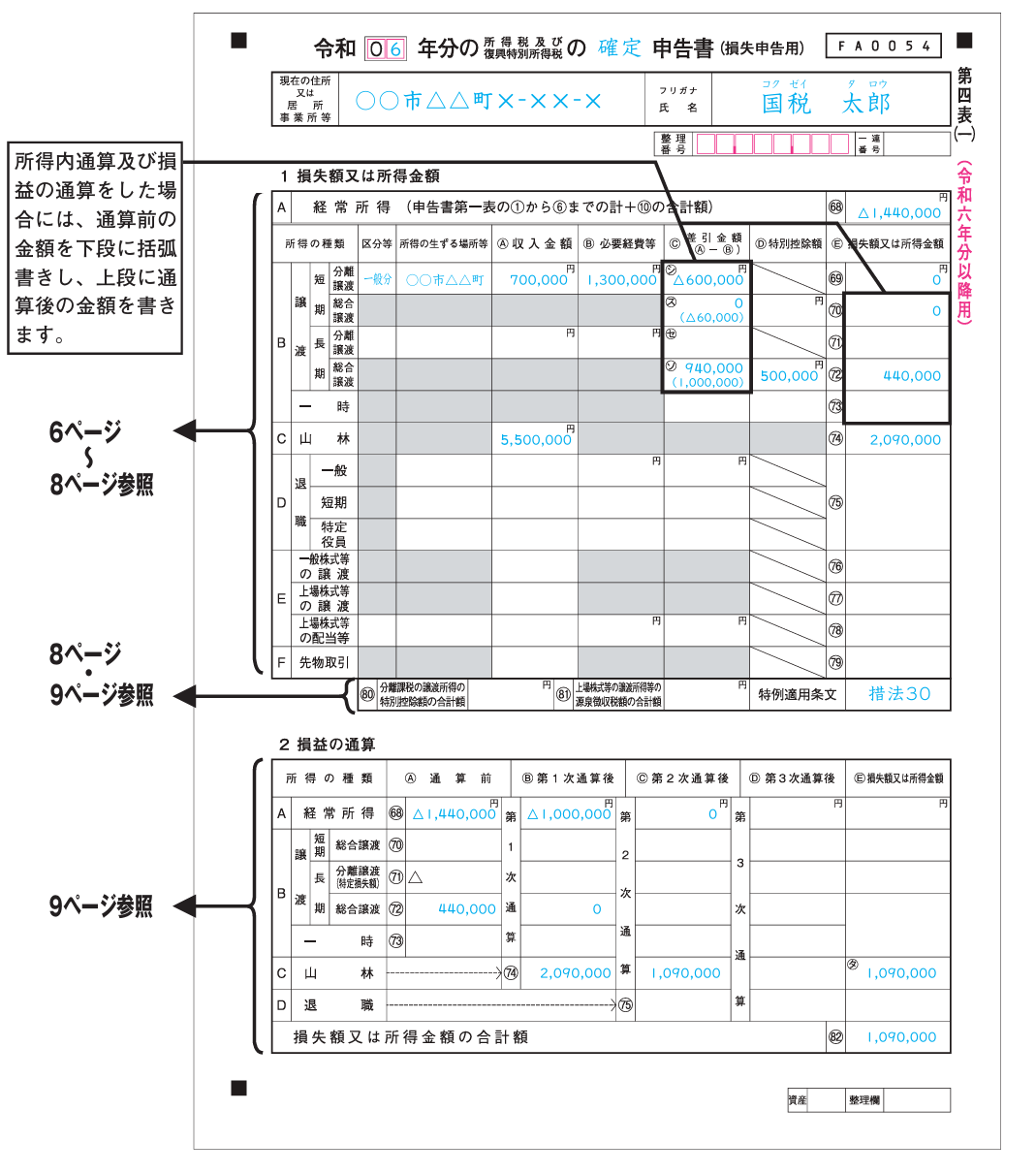 最後に、各所得の通算後の金額を合計し、「損失額又は所得金額の合計額」欄に記入します。合計が赤字の場合は「△」を付けて、翌年以降の繰越控除に備えます。