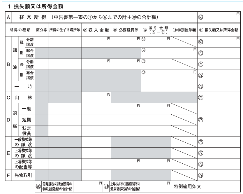 赤字や所得が発生した内容を、所得の種類ごとにまとめて記入します。事業所得や不動産所得などの経常的な所得は「経常所得」欄に、土地建物などの売却で得た所得は「譲渡・一時」欄に、一時的な退職金は「退職」欄に記載します。