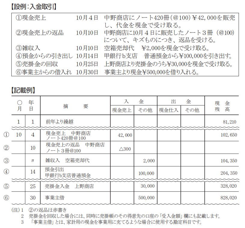 実際の帳簿の書き方は、帳簿の種類によって分かれます。たとえば現金出納帳だと、次のように記帳します。