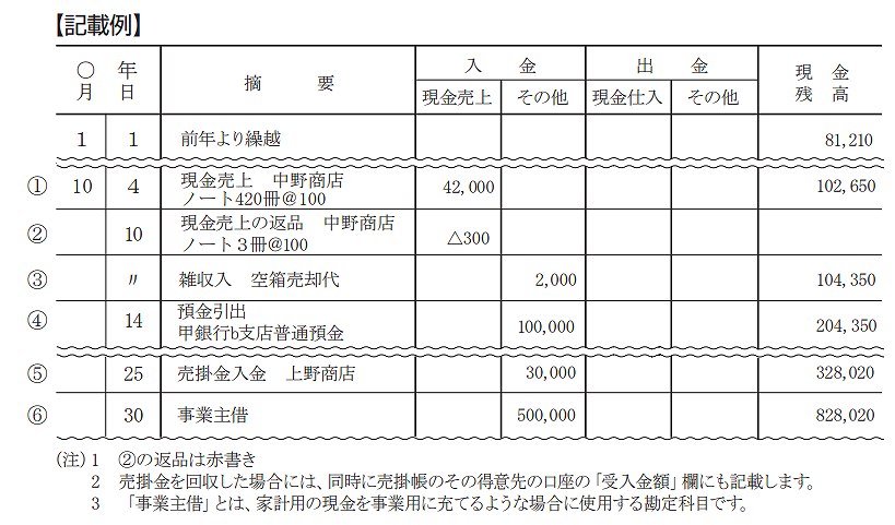 「入金」「出金」などと羅列していくスタイルです。「いつ、何に、いくら使ったか」が分かればよく、家計簿の延長線上で理解できます。たとえば、現金出納帳なら次のように記載します。